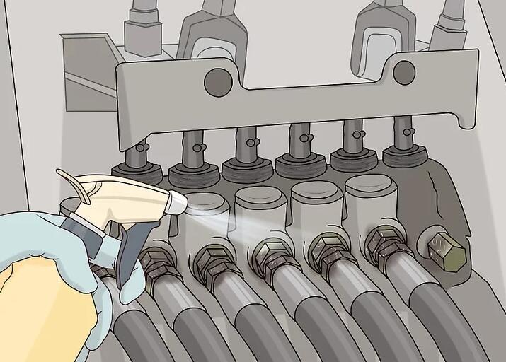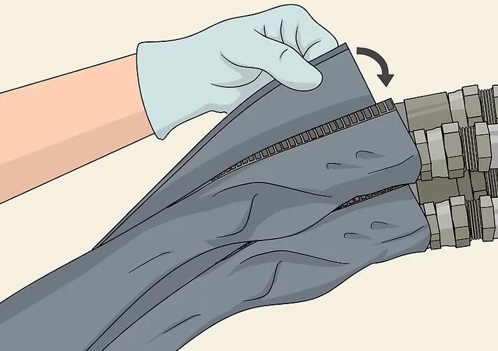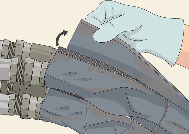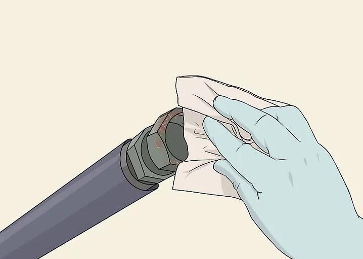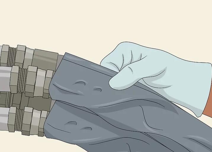 Wischen Sie vor der Installation alle Schlauchanschlüsse und Anschlüsse ab. Schmutz oder Dreck können in das Hydrauliksystem gelangen und es beschädigen. Stellen Sie sicher, dass alle Anschlüsse sauber sind, bevor Sie den Schlauch installieren. Verwenden Sie einen feuchten Lappen und reiben Sie alle Anschlüsse ab, um Schmutz zu entfernen.[9]