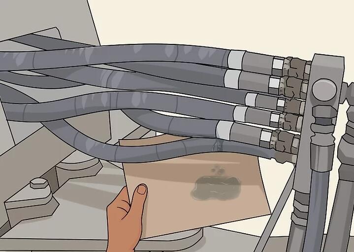 Reiben Sie Pappe über den Schlauch, um ein Ölleck zu finden. Wenn aus Ihrem Schlauch Hydraulikflüssigkeit austritt, ersetzen Sie ihn sofort. Wenn Ihre Maschine über mehrere Schläuche verfügt, suchen Sie den Schlauch mit dem Leck. Wischen Sie zunächst die Schläuche ab, um Flüssigkeiten oder Öl zu entfernen. Nehmen Sie dann ein Stück Pappe und reiben Sie damit am Schlauch entlang. Wenn Sie an der undichten Stelle vorbeikommen, sollte auf dem Karton ein nasser Fleck zu sehen sein. Dieser Schlauch muss ersetzt werden.[15]
