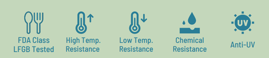 - Hervorragende Beständigkeit gegen thermische Alterung und Oxidationsmittel (Sauerstoff, Ozon, UV).